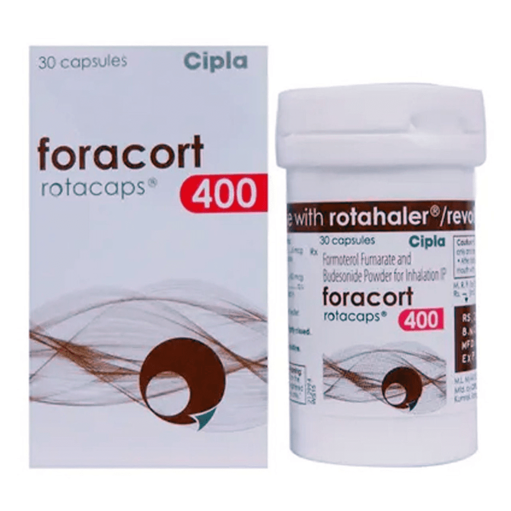 Foracort Rotacaps 400 mcg are dry-powder inhalation capsules containing a fixed-dose combination of budesonide, a corticosteroid, and formoterol fumarate, a long-acting bronchodilator. Designed for use with a compatible DPI device, these capsules support long-term management of asthma and COPD by reducing inflammation and maintaining open airways.